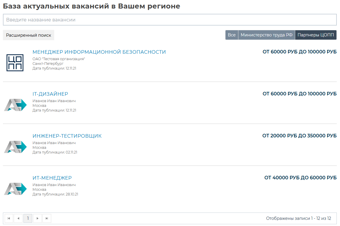 В базе представлены вакансии, размещенные партнерами ЦОПП,  а также вакансии c ресурса Trudvsem.ru от Министерства труда РФ.