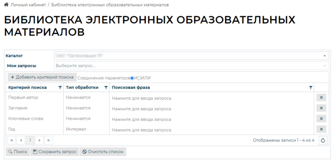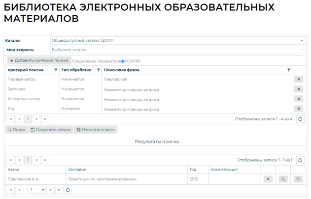 Для того, чтобы поиск электронных образовательных материалов (ЭОМ) осуществлялся одновременно по всем выбранным критериям поиска необходимо выбрать условие «И». Для того, чтобы результаты поиска удовлетворяли хотя бы одному из заданных критерию, необходимо выбрать условие «ИЛИ».