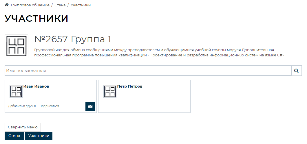 , в котором можно обмениваться сообщениями с преподавателем и обучающимися группы модуля.