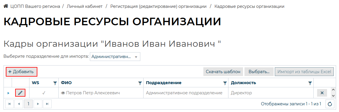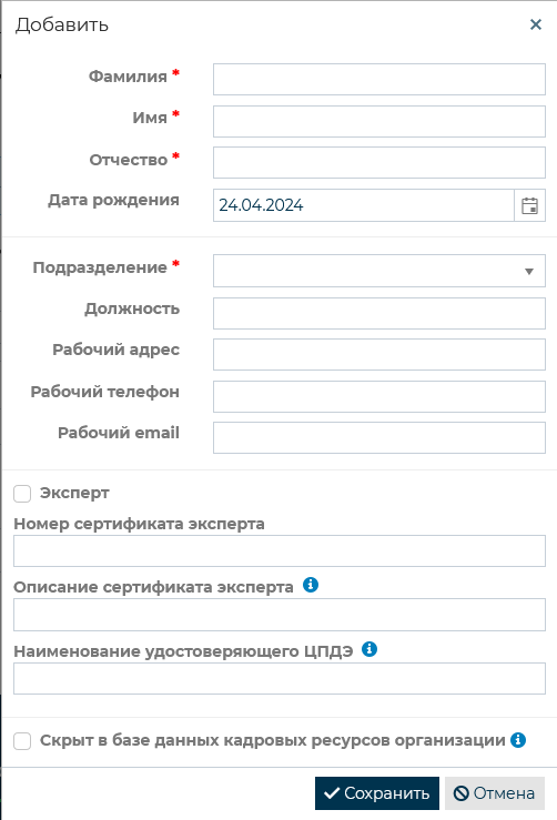 Для добавления/редактирования кадрового ресурса организации, необходимо нажать кнопку [Добавить]/[Редактировать] и заполнить поля в появившейся форме.
