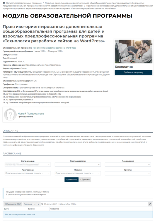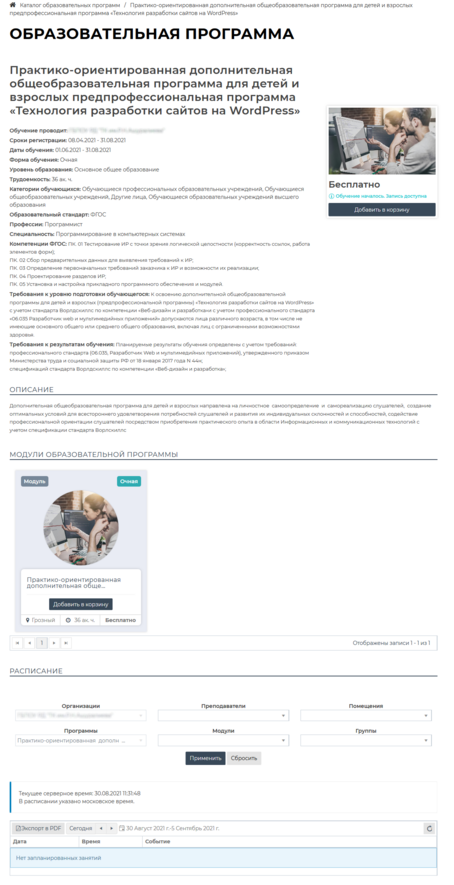 Пользователь имеет возможность ознакомиться с информацией о программе, кликнув по карточке выбранной программы. Загрузится страница с подробным описанием программы и модулями, входящими в её состав. Есть возможность добавить в Корзину все модули программы, нажав на кнопку
