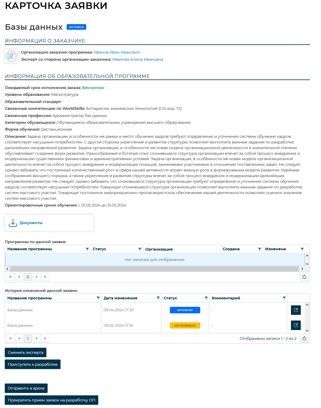 Карточка заявки на разработку образовательных программ
