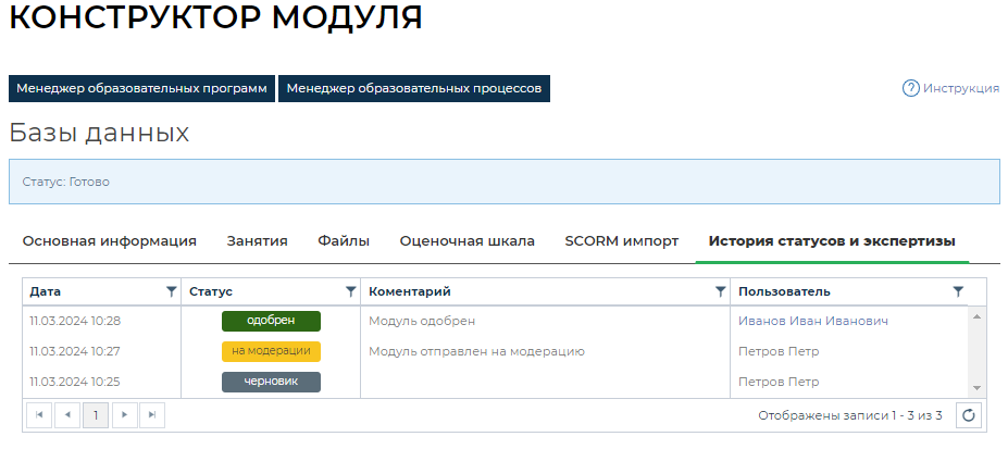 Конструктор модуля. Вкладка «История статусов и экспертизы»