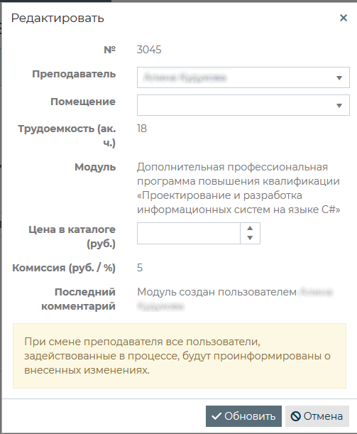 При нажатии на кнопку [Редактировать] открывается окно, в котором можно назначить преподавателя, указать помещение, в котором будут проходить занятия и установить цену на модуль (для того чтобы модуль в каталоге был бесплатным, поле «Цена в каталоге» следует оставить пустым).