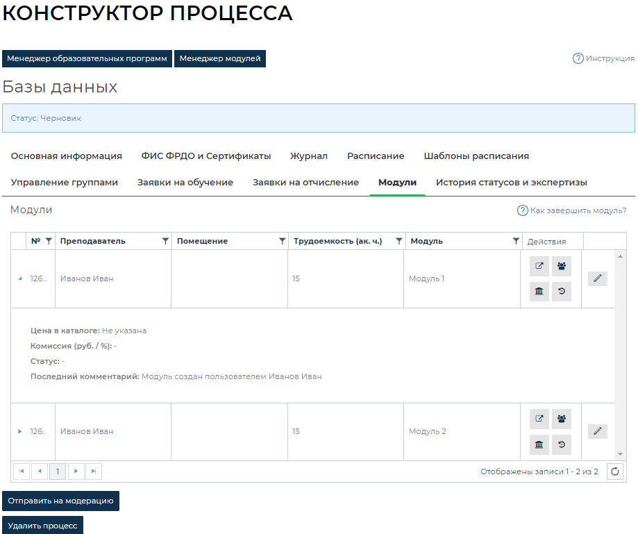 Конструктор процесса. Вкладка «Модули»