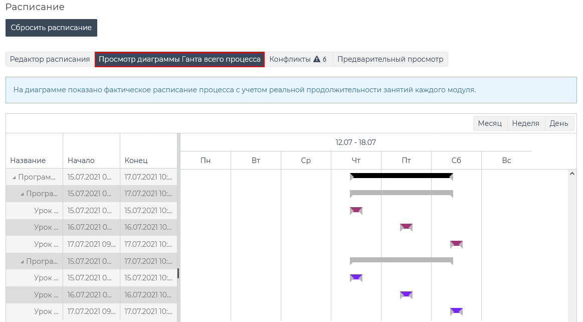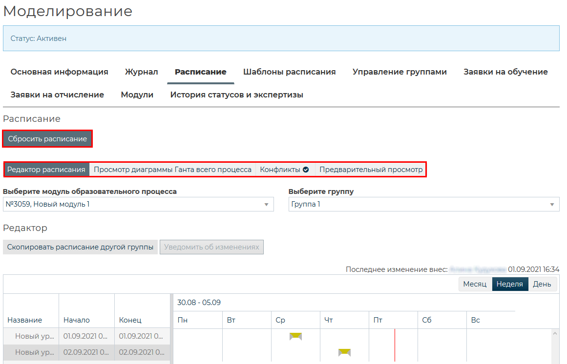 После подтверждения действий во всплывающем окне, на вкладке «Расписание» появляются окна выбора модуля образовательного процесса, группы, кнопка [Сбросить расписание], а также вкладки [Редактор расписания], [Просмотр диаграммы Ганта всего процесса], [Конфликты], [Предварительный просмотр].