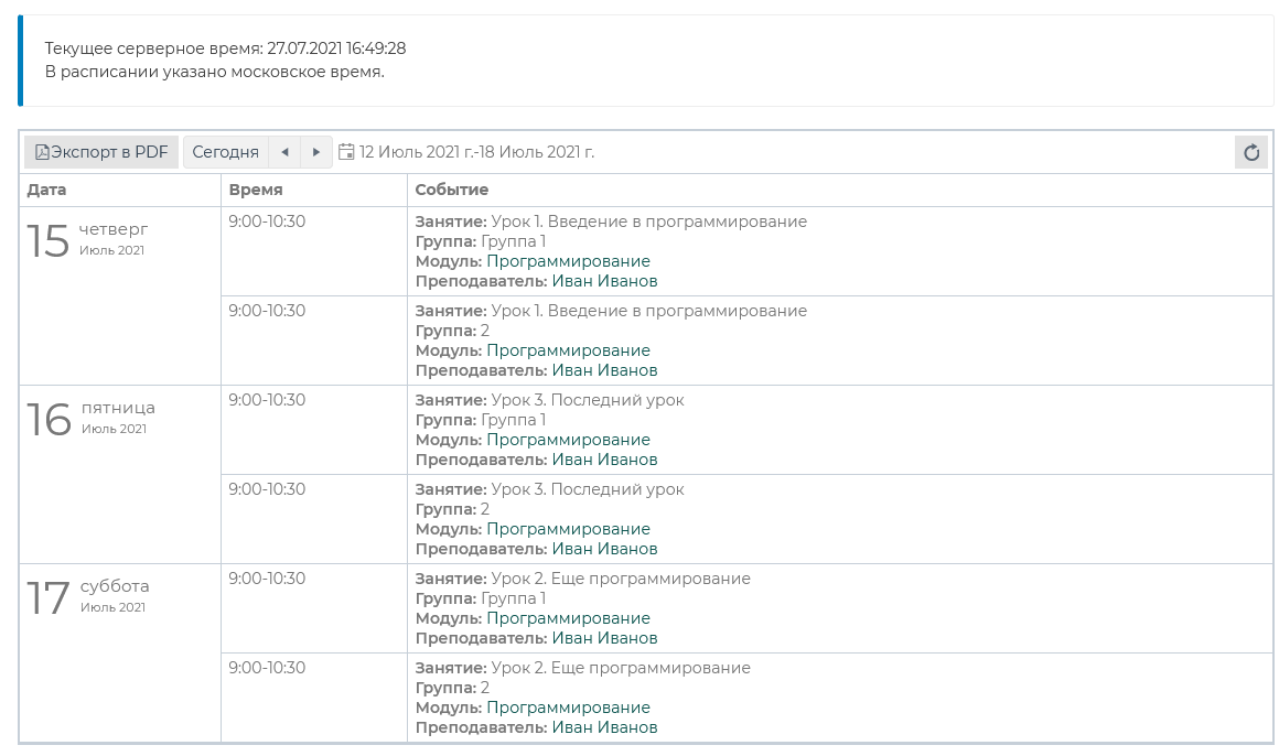 Для редактирования дополнительной информации по выбранному занятию необходимо кликнуть по значку