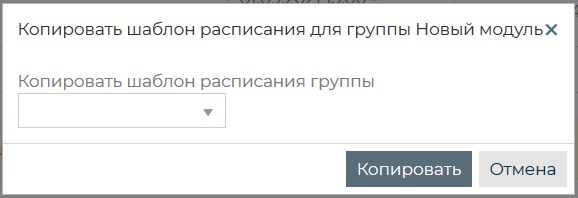 Для копирования шаблона расписания другой группы необходимо нажать кнопку напротив группы, для которой будет копироваться шаблон. Во всплывающем окне выбрать группу, шаблон расписания которой необходимо скопировать и нажать кнопку  .