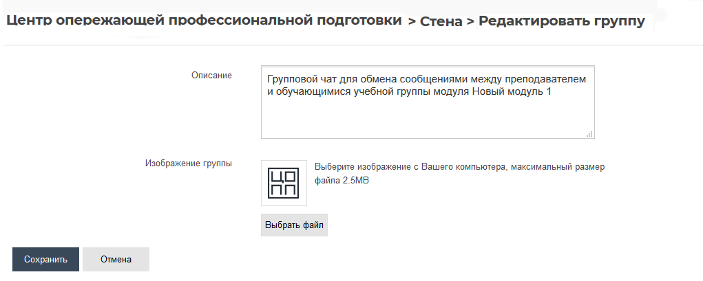 Для того, чтобы изменить описание группы или изменить изображение группы, необходимо нажать на кнопку .