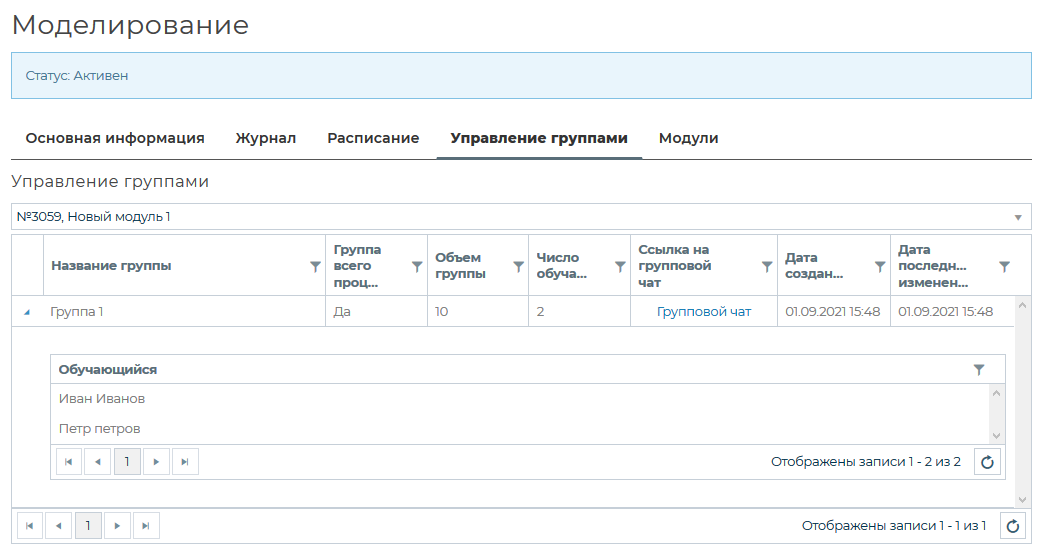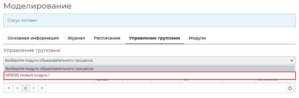 Для просмотра списка обучающихся групп необходимо перейти на вкладку «Управление группами» и нажать на стрелку в окне с надписью «Выберите модуль образовательного процесса» и выбрать из выпадающего списка модуль, по которому будет проходить обучение.