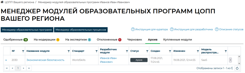 Менеджер модулей образовательных программ. Вкладка «Архив»
