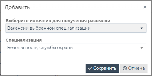 После выбора источника для получения рассылки. необходимо также выбрать организацию, либо специализацию.