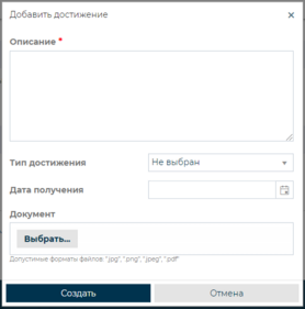 Далее в открывшейся форме заполнить описание достижения, выбрать подходящий тип, выставить дату получения и прикрепить подтверждающий документ и нажать на кнопку