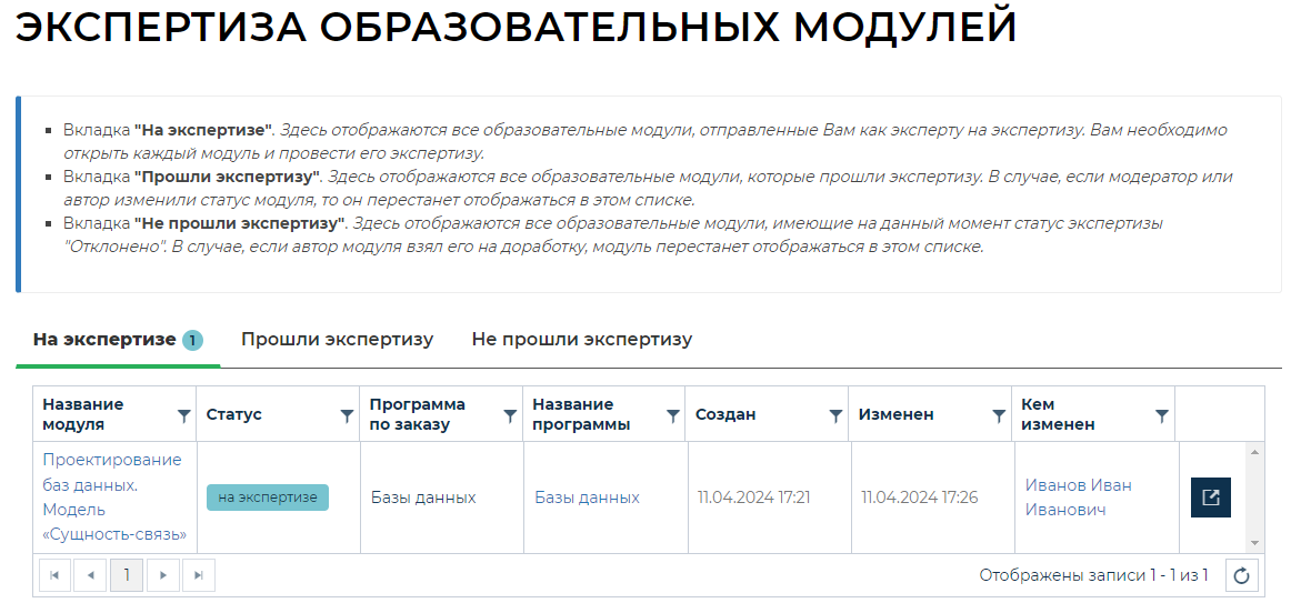 Вкладка «Прошли экспертизу». Здесь отображаются все образовательные модули, которые прошли экспертизу. В случае, если модератор или автор изменили статус модуля, то он перестанет отображаться в этом списке.