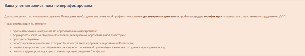 Для полноценного использования сервисов Платформы, необходимо заполнить свой профиль пользователя достоверными данными и пройти процедуру верификации пользователя Модератором ЦОПП.
