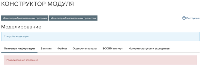 После отправки модуля на модерацию, его статус меняется с «Черновик» на «На модерации». В этом статусе модуль недоступен для редактирования.