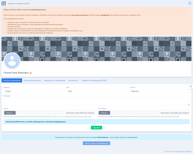 Профиль пользователя (COPP ID) После регистрации или авторизации на платформе ЦОПП пользователь попадает в свой профиль. Профиль пользователя на платформе ЦОПП (учетная запись не верифицирована)
