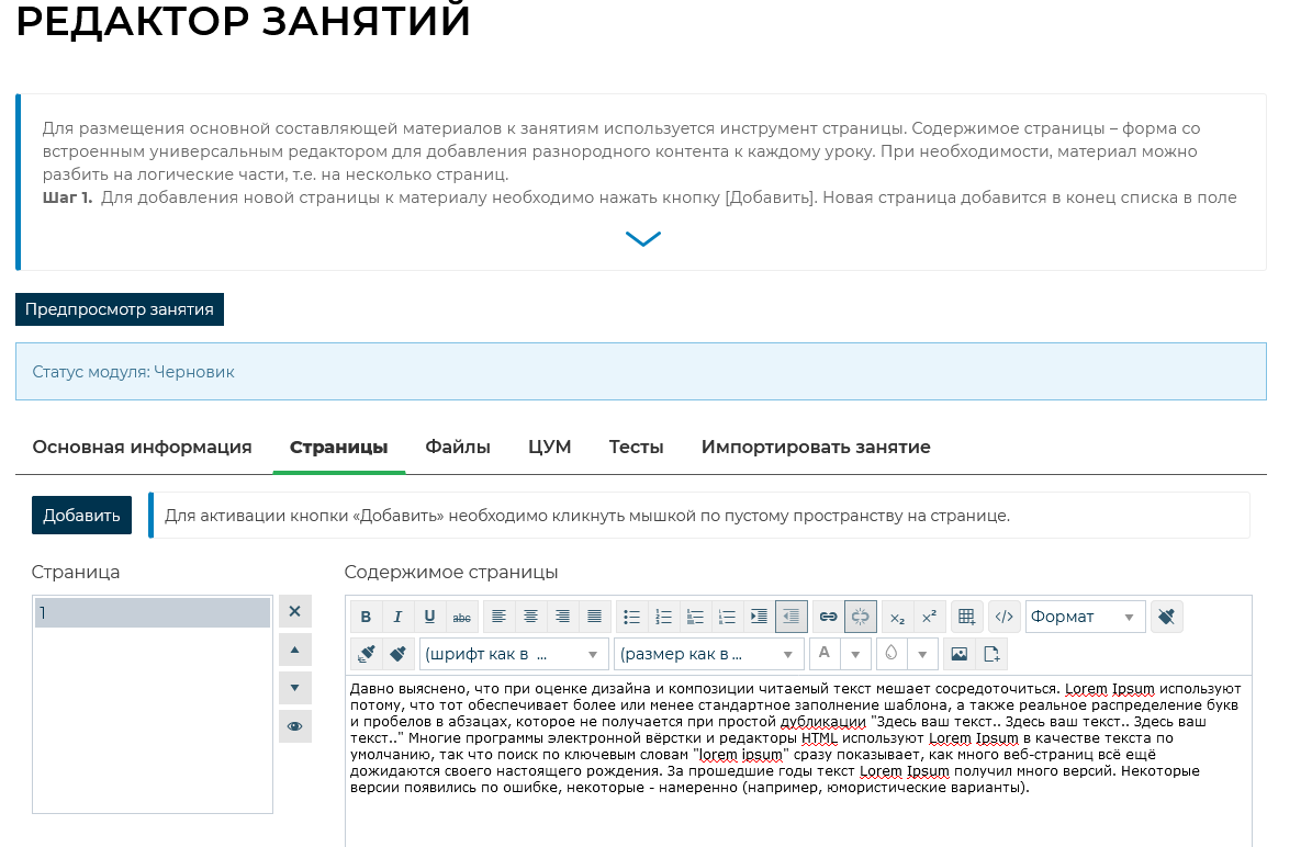 Для добавления информации на страницу необходимо выбрать страницу (кликнуть по названию) и добавить информацию в поле «Содержимое страницы». Содержимое страницы - форма со встроенным универсальным редактором для добавления разнородного контента к каждому уроку. При необходимости, материал можно разбить на логические части, т.е. на несколько страниц.