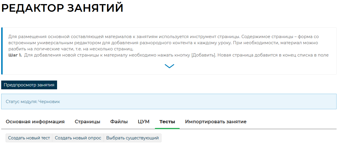 Для добавления к уроку тестов и анкет необходимо перейти на вкладку «Тесты».