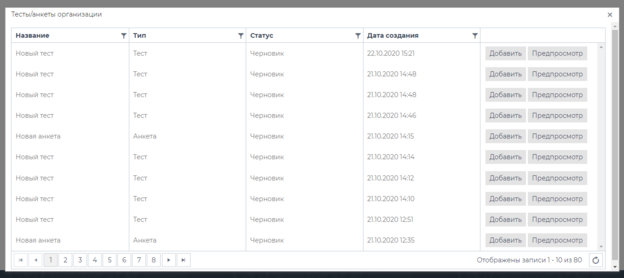 Для добавления существующего теста/опроса, необходимо нажать на кнопку [Выбрать существующий] и выбрать тест/опрос в появившемся окне.