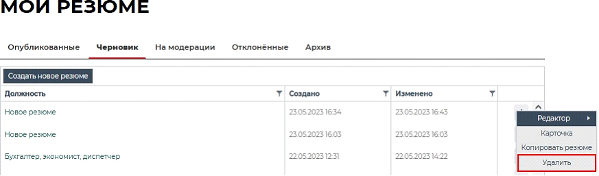 При необходимости, пользователь может удалить созданное ранее резюме, отправив его в «Черновик». Для того чтобы удалить резюме, пользователю нужно перейти на страницу «Мои резюме» и нажать кнопку , находящуюся справа от каждой записи в перечне пользовательских резюме и выбрать пункт [Удалить].