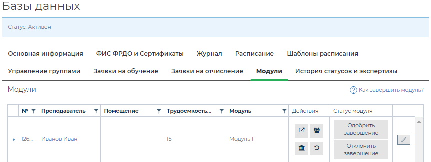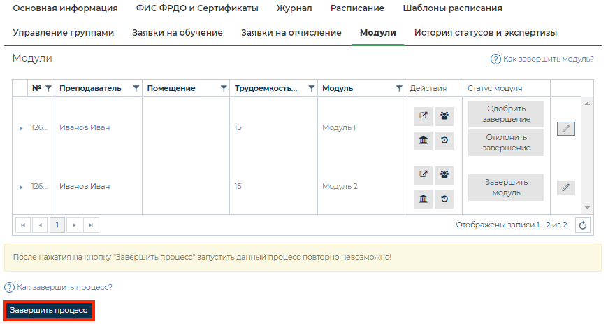 Если есть модули, на которых нет никаких заявок или нет ни одной необработанной заявки и нет активных студентов в группе, то ответственный может завершить процесс без подачи преподавателем заявки на завершение модуля.  У преподавателя также имеется возможность завершить свой модуль, который удовлетворяет перечисленным выше условиям.