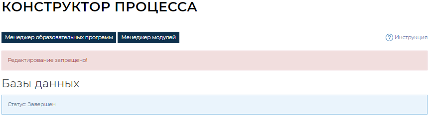 Для завершения процесса нужно выбрать в разделе меню личного кабинета Конструктор образовательных программ, нажать Менеджер образовательных процессов и перейти на вкладку «Активные», нажать на кнопку меню и выбрать пункт «Конструктор».